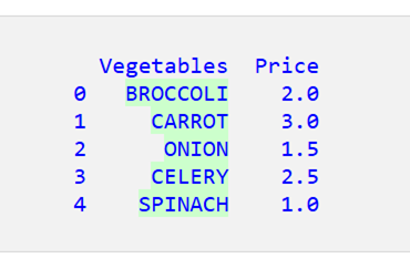 まず、5 つの野菜 (すべて小文字) とその価格を含む DataFrame を作成しましょう。