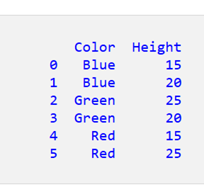 data = {'Color': ['Blue', 'Blue', 'Green', 'Green', 'Red', 'Red'],
