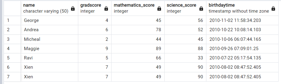 select *, DATE_PART('seconds', birthdaytime::timestamp) AS seconds from Student_detail結果のテーブルには秒の列ができます